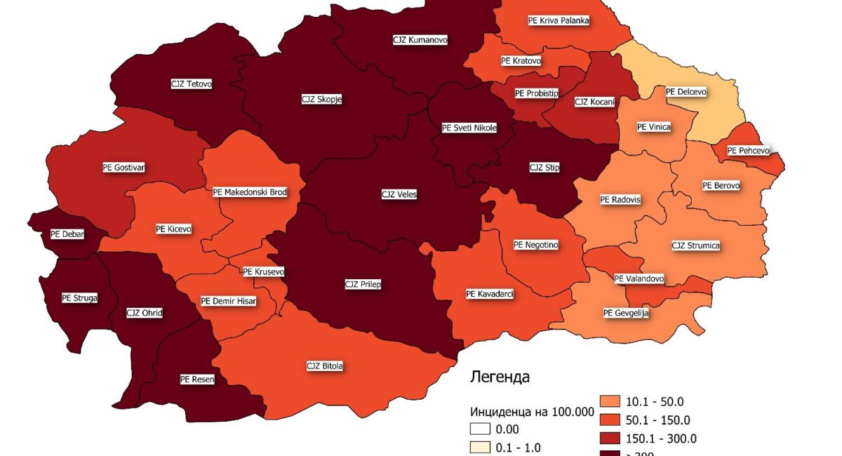 Новозаболени се регистрирани во 26 града, при што најголем процент на новозаболени има во Скопје (42,3%) и во Тетово (8,9%). Во 16 града во земјата, за истиот период, бројот на новопотврдени случаи е под 20.