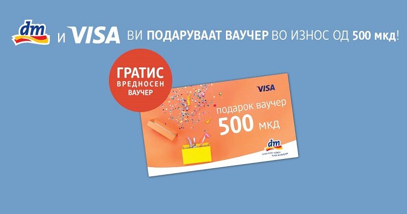 Почнувајќи од 10.8.2020, за секоја сметка направена во дрогериите на dm чиј износ надминува 2.000 денари, а е платена со КОЈА БИЛО VISA КАРТИЧКА, добивате вредносен ваучер од 500 денари.